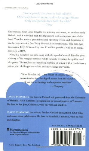 Once upon a time Linus Torvalds was a skinny unknown, just another nerdy Helsinki techie who had been fooling around with computers since childhood. Then he wrote a groundbreaking operating system and distributed it via the Internet -- for free. Today Torvalds is an international folk hero. And his creation LINUX is used by over 12 million people as well as by companies such as IBM.Now, in a narrative that zips along with the speed of e-mail, Torvalds gives a history of his renegade software while candidly revealing the quirky mind of a genius. The result is an engrossing portrayal of a man with a revolutionary vision, who challenges our values and may change our world.Rang parmi les ventes Amazon: #35838 dans LivresMarque: Brand: HarperBusinessPublié le: 2002-06-04Sorti le: 2002-06-04Langue d'origine: AnglaisNombre d'articles: 1Dimensions: 8.00" h x .65" l x 5.31" L, .47 livres Reliure: Broché288 pagesPrésentation de l'éditeurOnce upon a time Linus Torvalds was a skinny unknown, just another nerdy Helsinki techie who had been fooling around with computers since childhood. Then he wrote a groundbreaking operating system and distributed it via the Internet -- for free. Today Torvalds is an international folk hero. And his creation LINUX is used by over 12 million people as well as by companies such as IBM.Now, in a narrative that zips along with the speed of e-mail, Torvalds gives a history of his renegade software while candidly revealing the quirky mind of a genius. The result is an engrossing portrayal of a man with a revolutionary vision, who challenges our values and may change our world.Biographie de l'auteurLinus Torvalds was born in Finland. He graduated from the University of Helsinki and lives with his wife, the six-time karate champion of Finland, and his children. Linus currently works as a programmer on several projects for Transmeta.David Diamond has written regularly for such publications as the New York Times, Business Week, and Wired. He is executive editor of Red Herring Magazine and lives in Kentfield, California, with his wife and daughter.